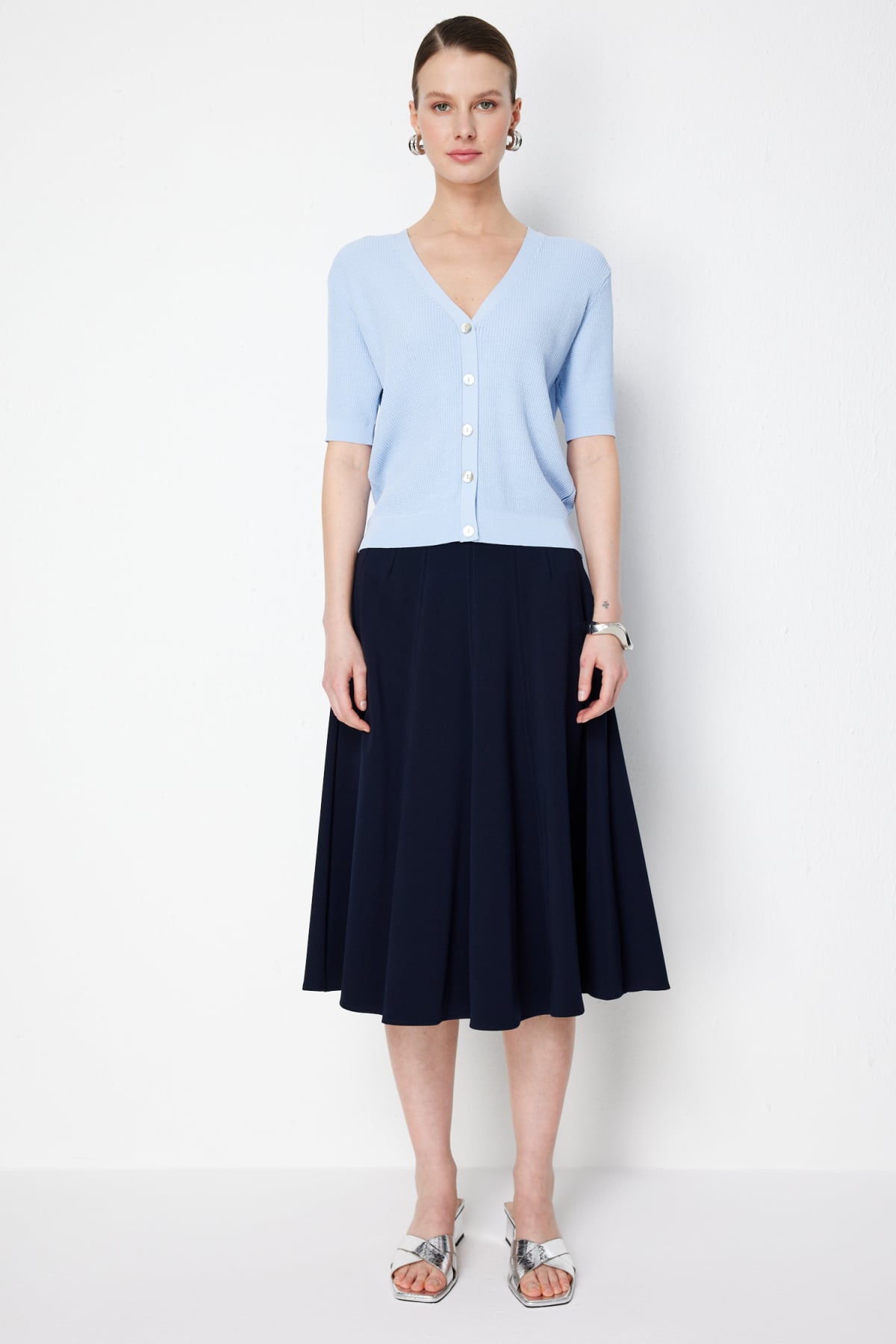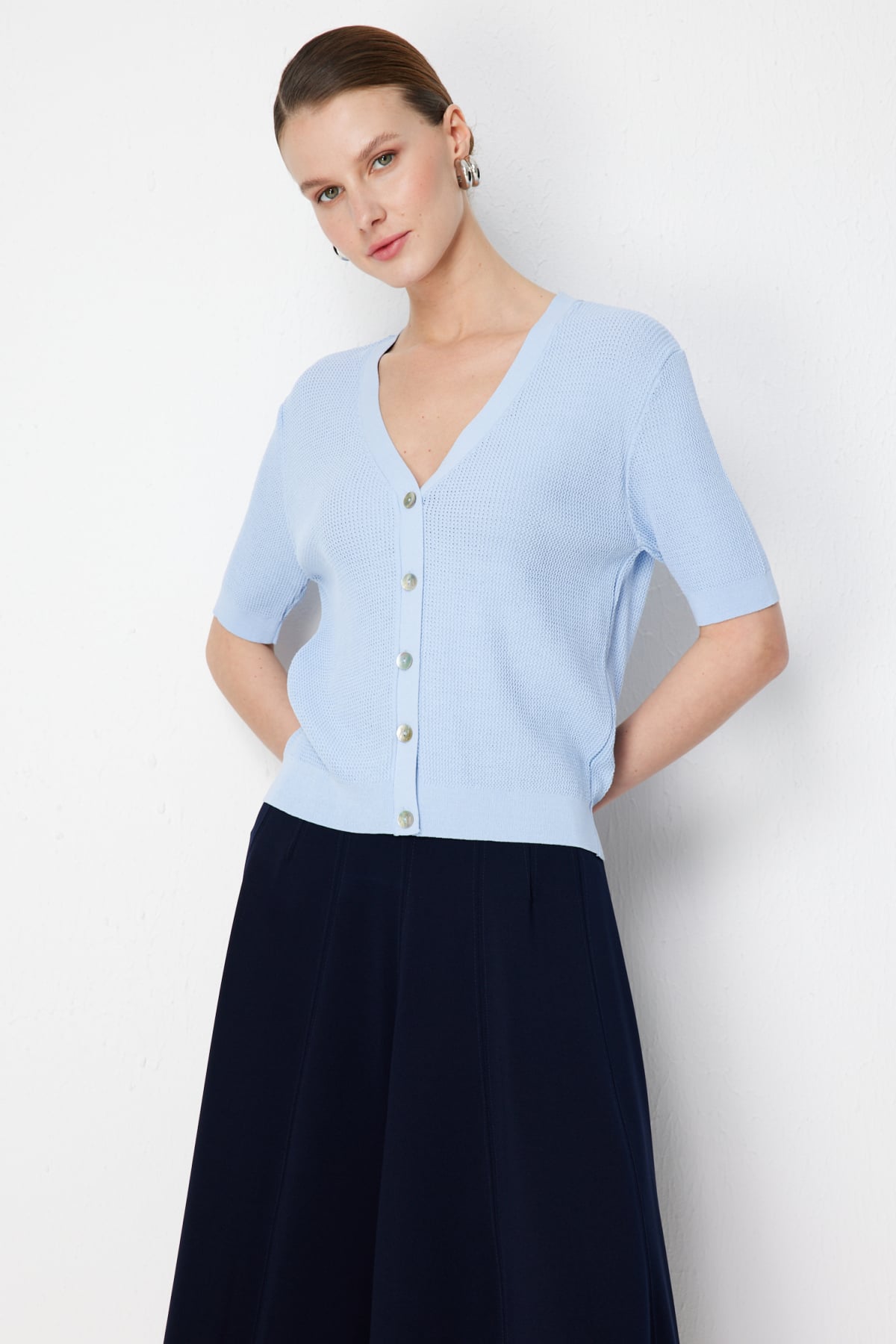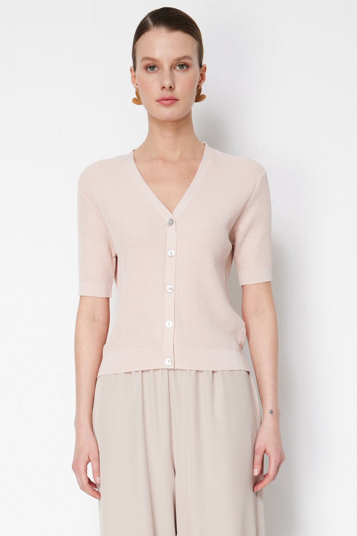 Ürün Kalıbı: Regular Ürün Kalınlığı: İnce Ürün Boyu: 52 Kumaş İçeriği: %51 Viskon %48 Polyamid %1 Elastan Kumaş Tipi: Dokuma Astar Durumu: Astarsız Yaka Tipi: V Yaka Kol Tipi: Kısa Kol Kol Boyu: Kısa Kapama Şekli: Düğmeli Ürün Sezonu: 2026 Yaz Manken Ölçüleri: 1.76 cm 84/61/89 - Manken en küçük bedeni giymektedir.